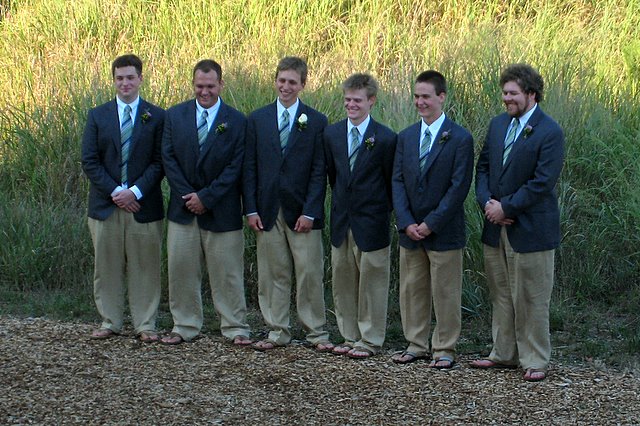 One of the best attires suitable for groomsmen to wear during spring or summer season is khaki suit. Khaki dress has a good refreshing tone which is very accordant to the kind of weather or temperature of that day. If not fully khaki dress, the groomsmen can wear khaki pants and white formal shirt with or without collar. Other than those, you can find other kinds of formal shirts and polo shirts for men. There is the classic French blue shirt with collar that can also make each and every man more handsome for the occasion. The key secret in finding the right attire for groomsmen for summer or spring wedding is light color.